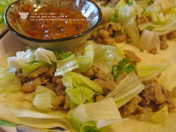 這道內餡是豬肉,將青菜包起來沾著莎莎醬的吃法相當清爽
